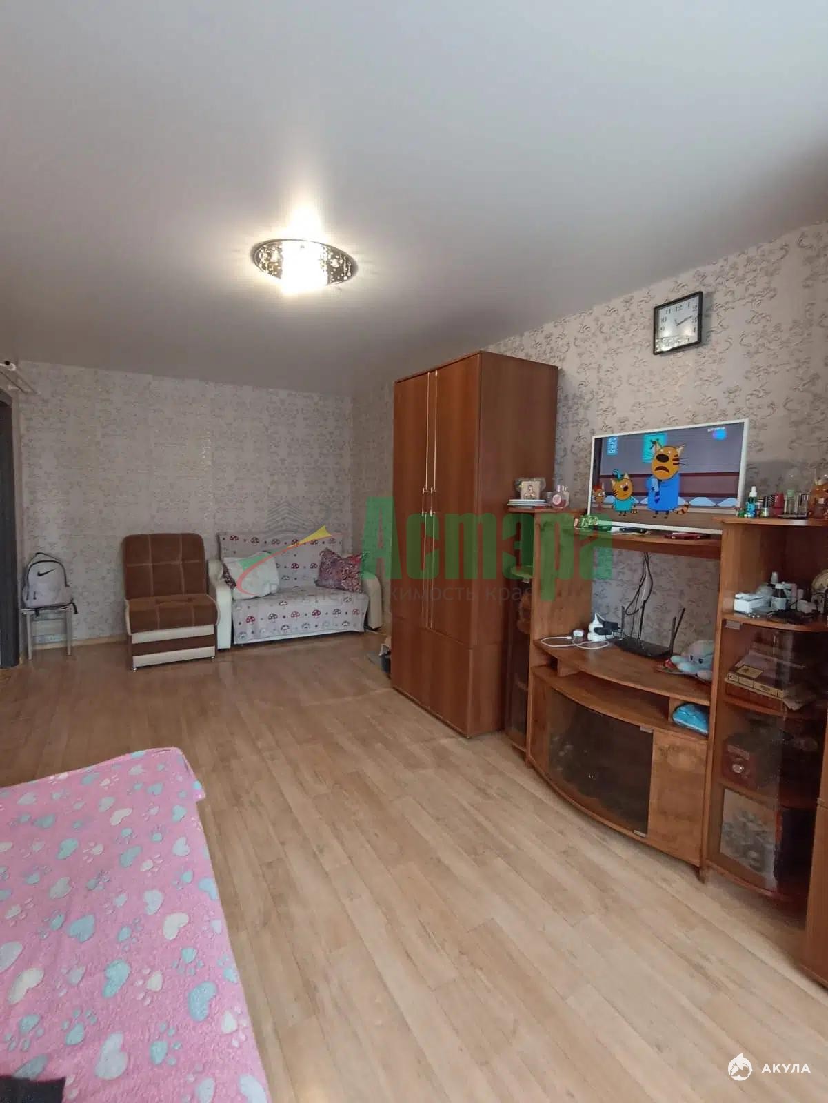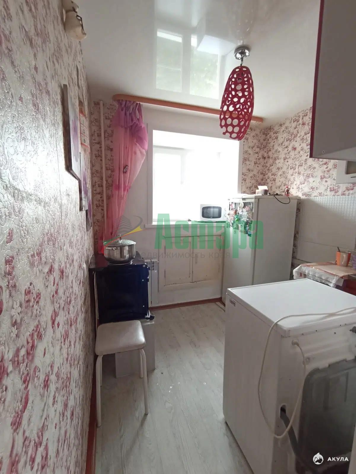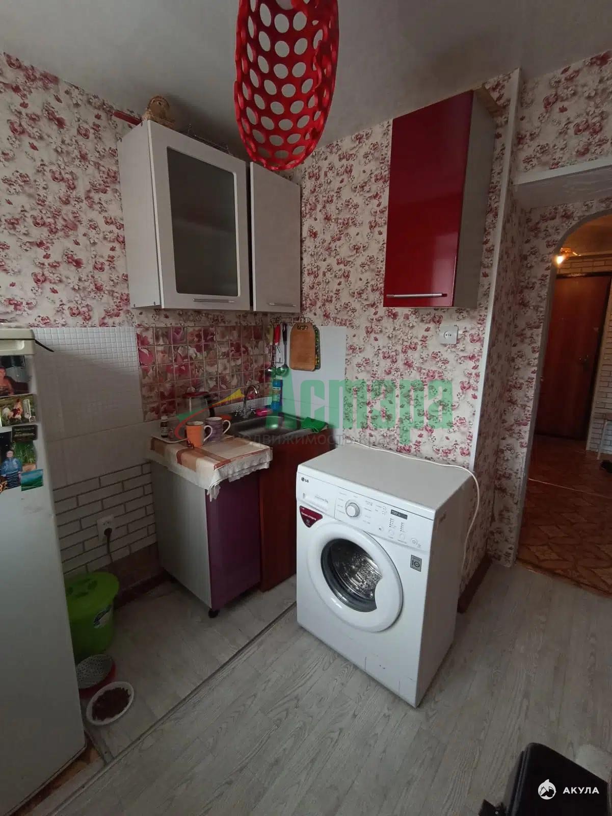 Кухня оборудована необходимой техникой, включая холодильник и стиральную машину. В комнате установлен вместительный шкаф и диван, создающие комфортное пространство для отдыха. Санузел совмещённый, оформлен в светлых тонах.