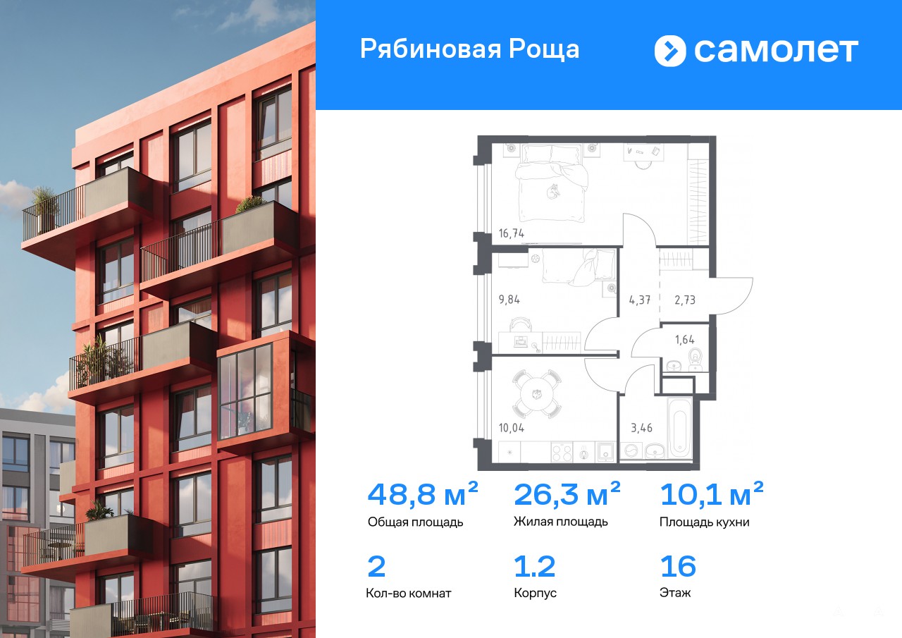 Строим кварталы для жизни с заботой о будущем. Предлагается 2-комнатная квартира комфорт-класса 48, 82 кв.м в корпусе 1.2 на 16 этаже, в ЖК «Рябиновая Роща»