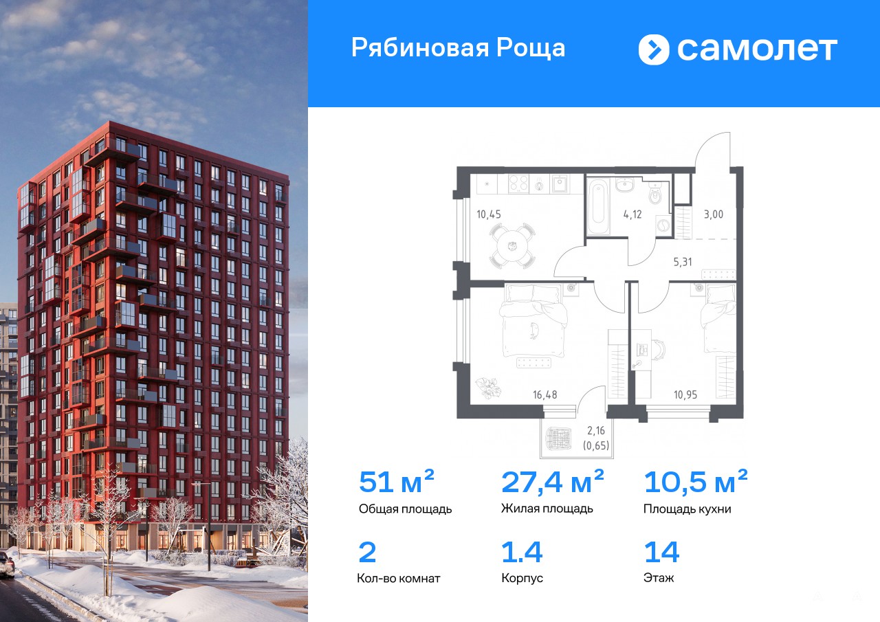 Строим кварталы для жизни с заботой о будущем. Предлагается 2-комнатная квартира комфорт-класса 50, 96 кв.м в корпусе 1.4 на 14 этаже, в ЖК «Рябиновая Роща»