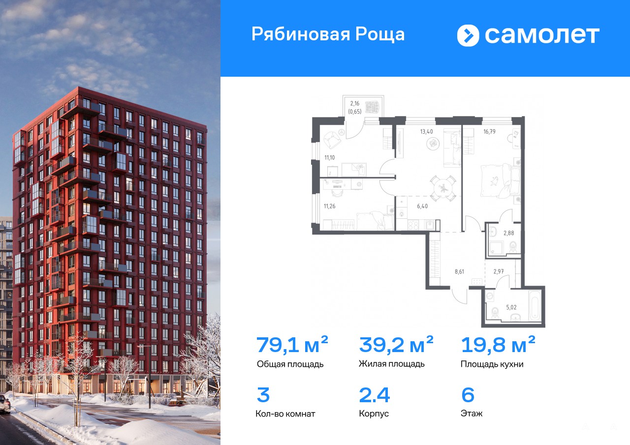 Строим кварталы для жизни с заботой о будущем. Предлагается 3-комнатная квартира комфорт-класса 79, 08 кв.м в корпусе 2.4 на 6 этаже, в ЖК «Рябиновая Роща»